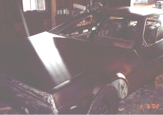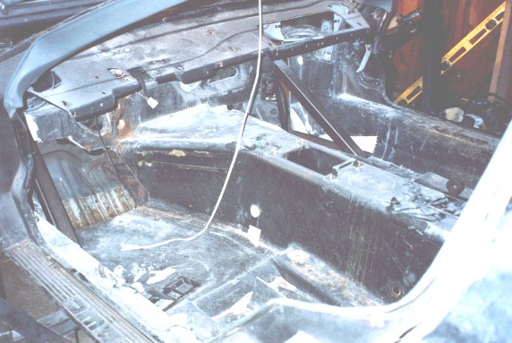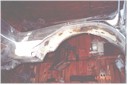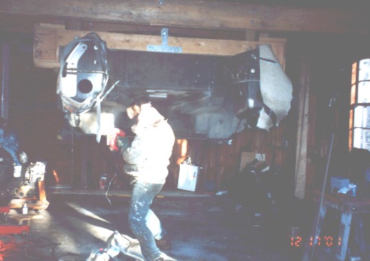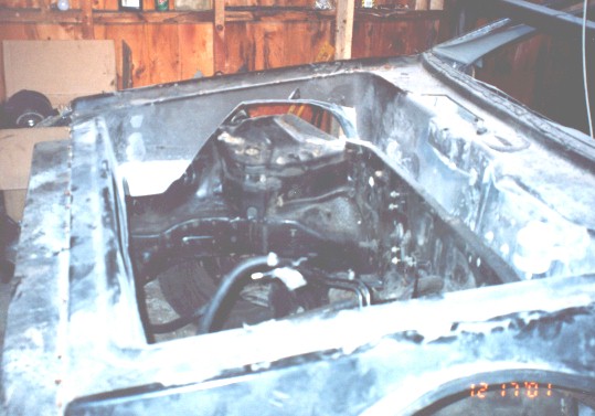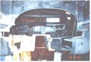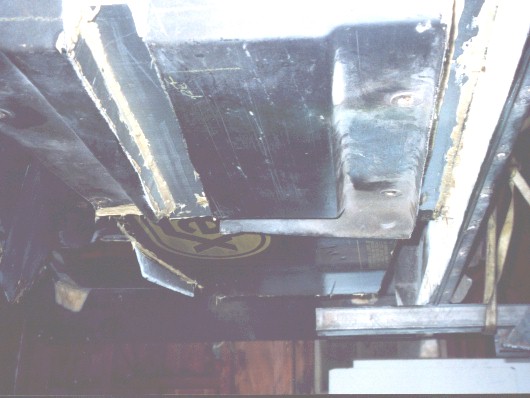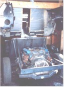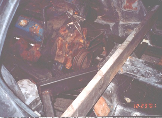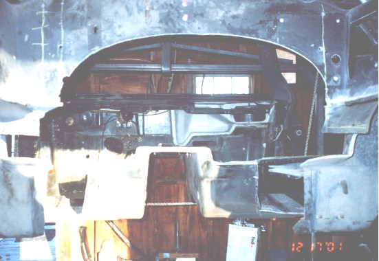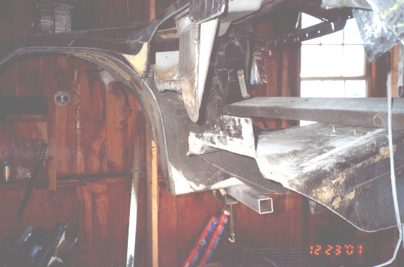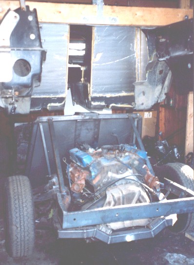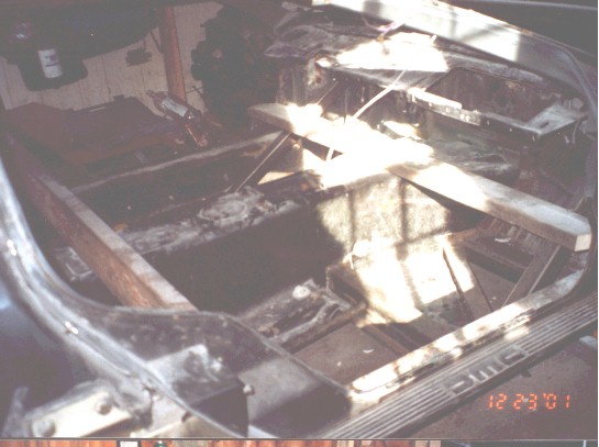 Interference testing. In these pictures, the underbody is about 4 inches above its final location, and still interfering in several anticipated points, most notably the side rails, crossbeam, and the firewall.