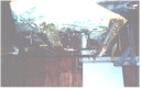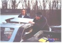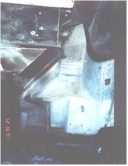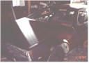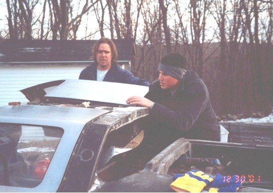 The flimsiness of the perforated underbody presented a design challenge. It seemed unlikely that the underbody could, at this stage, maintain the correct shape under the force of its own weight. It was necessary to lower the underbody skeleton onto the frame, and install the body panels and doors, prop the rickety structure into position, verify the geometry of the underbody, and define the final mounting points between the underbody and frame. I'm glad I went through this trouble. On close inspection, it was apparent that the front and rear of the perforated underbody were pulled down 3/8 inch by gravity. Going through the trouble of making these measurements allowed definition of the final mounting points with sufficient precision to line the body panels to at least factory specifications. Wearing the headband is my friend Dennis helping me install the doors.