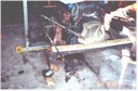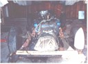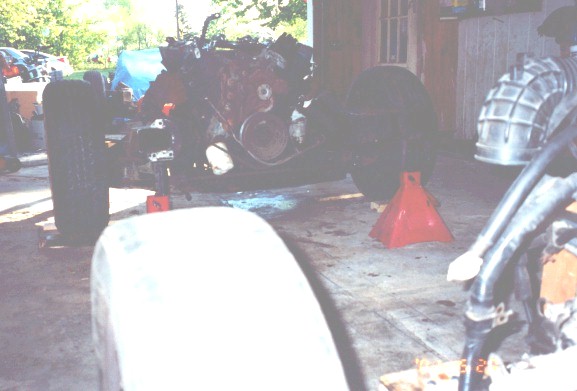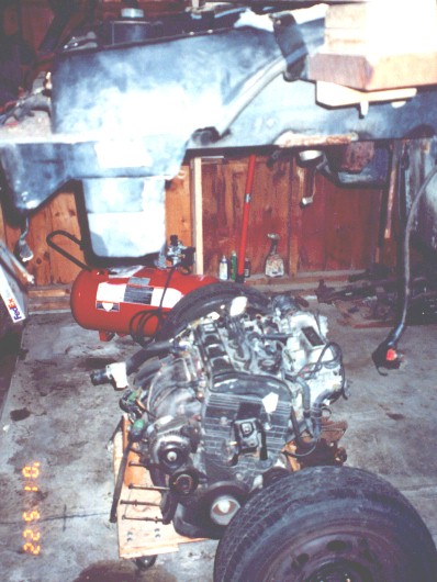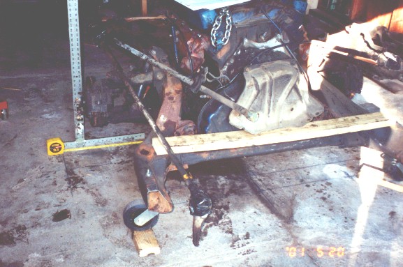 Everything is propped into position just long enough to make the measurements. The 1970 engine is resting in the unaltered 1985 cradle with the help of a noticeably deflected two by four. At the time, I had not decided which torsion bars to use, the 1970 or 1985 versions. There's one of each in the picture. The 1970 ones are stronger and stiffer, and were the eventual choice.