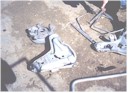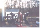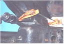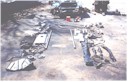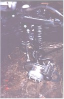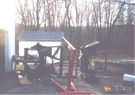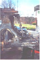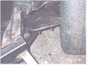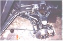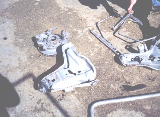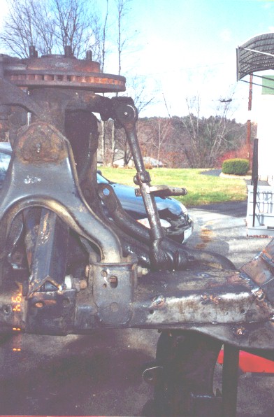 Removing the rear steering gear. Originally I intended to have four wheel steering, but later decided that it would have been overkill, and costly in terms of weight, money, time, and risk, for only a marginal increase in the overall outrageousness factor of the car.